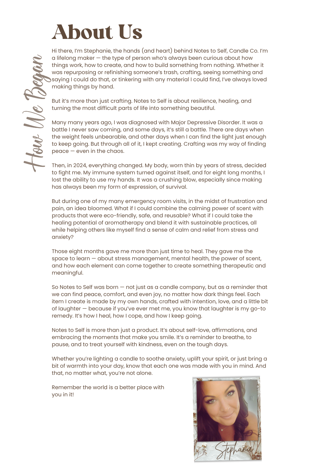 At Notes to Self Candle Co., we believe a candle is more than just a flame — it's a gentle reminder to take a moment for yourself, to breathe deeply, and to laugh a little. Our candles are crafted with intention, designed to fill your space with warmth, positivity, and a sprinkle of joy. Each candle is a personal affirmation, a message of self-love, and a celebration of life’s simple pleasures with a side of laughter. We take pride in using premium, eco-friendly ingredients to create a clean, long-lasting burn. Our candles are made with sustainable coconut-soy wax and natural wood wicks, ensuring you can enjoy their glow, listen to crackle all without compromising the planet. Every scent is carefully curated to evoke a sense of peace, calm, and uplifting energy — from the grounding depth of woodsy aromas to the light, playful notes of citrus and florals. At Notes to Self, we don’t just want you to light a candle — we want you to light up your soul. It’s self-care with a side of laughter, because every moment of serenity deserves a little fun.