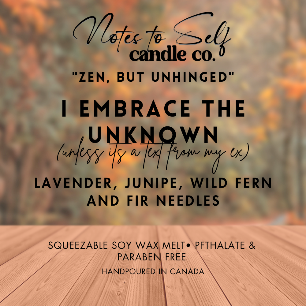Step into the mystery with I Embrace the Unknown (Unless It's A Text From My Ex) — a scent that’s fresh, calming, and full of nature’s untamed beauty. Lavender, juniper, wild fern, and fir needles come together in a crisp, earthy blend that’s perfect for those who welcome the unexpected... just not that kind of unexpected.