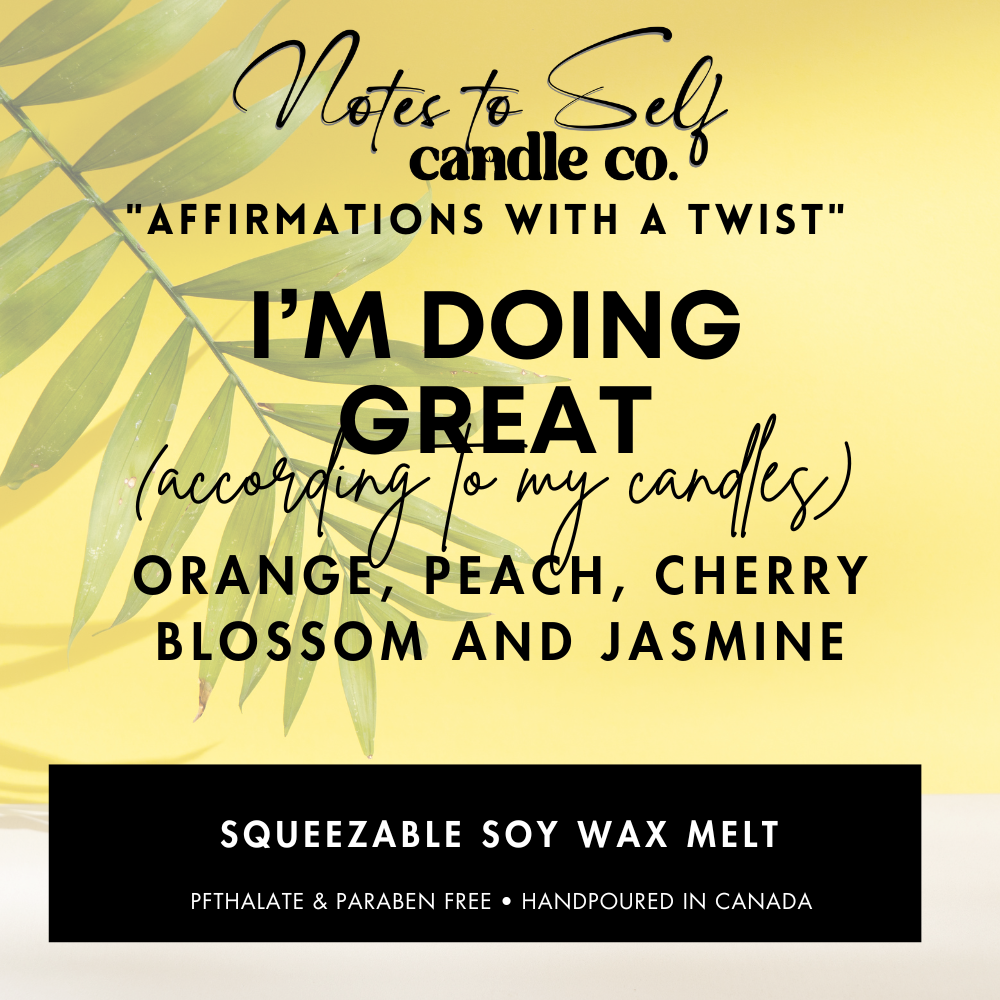 Light up your space with I’m Doing Great (According to My Candles) — a sweet blend of orange, peach, cherry blossom and jasmine. It’s the perfect scent for when you need a little reminder that, despite everything, you’re thriving. Your candles believe in you, and so should you. Fresh, fruity, and just a touch cozy — it's the scent of success, even if it’s just a little bit self-declared.